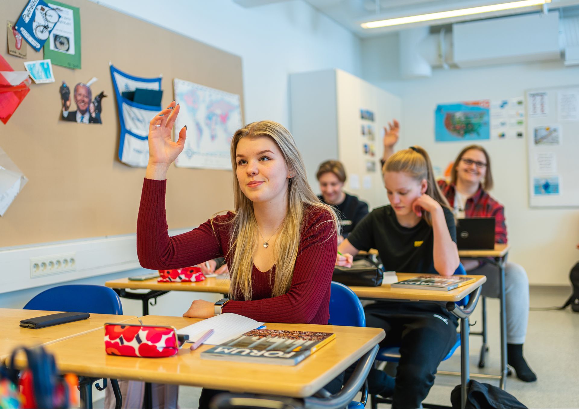 学校专注于科学领域,并致力于增加其国际活动。我们的特色是医学和自然科学方向,你可以学习比普通芬兰高中更多的自然科学课程。如果你希望在未来学习医学并在大学毕业后成为一名医生,这个方向将非常适合你。如果你对气候变化感兴趣,这个方向也适合你。